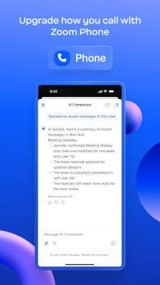 And with your Pro or Business Zoom license you have access to AI Companion woven throughout Zoom Workplace. You can get caught up quickly with a summary and key points from your unread messages, draft new content, and keep conversations focused and impactful. It’s your personal assistant across Zoom Workplace, available at no additional cost with your paid Zoom license, available wherever you are from your mobile device.